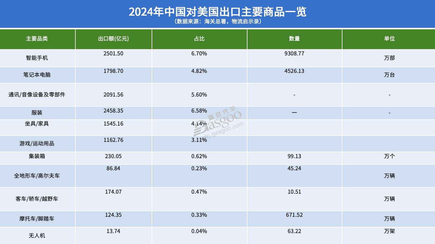 数据显示,2024年,中国对美国的出口总额达到了37337。2亿元,同比增加了4。9%;而从美国进口的商品总额为11640。61亿元,较着呈现商业顺差。通过度析两国的进出口商品布局,能够看出较着的财产互补和分工特点。中国对美国出口的次要产物集中正在机械电子类,占出口总额的41。45%,达15475。84亿元。此中,智妙手机(2501。50亿元)、笔记本电脑(1798。70亿元)和通信及音像设备及零部件(2091。56亿元)是次要的出口商品。此外,纺织鞋服类产物(4686。26亿元)和家具/玩具/活动杂项成品(4594。61亿元)别离占出口总额的12。55%和12。31%,配合形成了中国对美出口的三大支柱。而中国从美国进口的商品则以高科技和资本类产物为从。机械电子类产物占进口总额的23。17%(2697。30亿元),此中集成电(838。77亿元)和半导体系体例制设备及零部件(319。46亿元)是环节构成部门。值得出格关心的是,中国从美国进口的航空器、航天器及其零件的依存度高达50%,这是中国对美进口依赖度最高的产物类别,表白中国正在航空航天范畴对美国手艺和产物有着较大的依赖。农副食物类占进口总额的16。33%(1901。20亿元),其曲达基因黄大豆的进口额为856。48亿元,占比7。36%。能源类产物则是第三大类进口商品,占比14。12%(1643。34亿元),次要包罗液化丙烷/丁烷(827。44亿元)和原油(428。53亿元)。正在汽车财产方面,中国对美国的出口包罗全地形车/高尔夫车(86。84亿元)、客车/轿车/越野车(174。07亿元)和摩托车/脚踏车(124。35亿元),总出口额为385。26亿元,占出口总额的约1%。取此比拟,中国从美国进口越野车/小轿车/小客车达517亿元,占进口总额的4。4%,显示出中国正在汽车范畴对美国的依赖仍然较大。