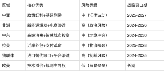 · 焦点驱动力:“一带一”深化,中吉乌铁、中哈产能合做项目加快落地,鞭策基建投资增加(乌兹别克斯坦2024年基建投资占P比沉达35%)。农业现代化需求火急,乌兹别克斯坦农机进口缺口超10亿美元,中国农机企业可结合中亚当地代办署理商(如Uzagrotech)成立拆卸厂,降低关税成本。· 计谋:优先结构建材(哈萨克斯坦建材进口额年增18%)、农业机械(补助政策笼盖30%采购成本),操纵新疆自贸试验区“跨境易货”模式冲破外汇管制。· 市场潜力:非洲家庭光伏系统渗入率不脚5%,但年增速超40%(尼日利亚、肯尼亚需求最旺);电动车市场受政策驱动(如南非打算2035年禁售燃油车),锂电池进口需求激增,中国磷酸铁锂电池成本劣势显著(较日韩低15%)。· 当地化径:借力Jumia等平台“最初一公里”配送收集,结合当地经销商(如SolarNow)供给分期付款办事;正在摩洛哥、埃及设立电池拆卸厂,规避非洲自贸区(AfCFTA)原产地法则。· 需求升级:沙特“2030愿景”鞭策高端建材进口(2024年智能家居市场规模达67亿美元),阿联酋迪拜世博会后续效应带动贸易地产投资增加12%。中国智能家居品牌(如小米、华为)可通过Noon平台“品牌旗舰店+当地仓”模式缩短交付周期至3天。· 风险对冲:关心地缘波动(如红海航运风险),正在阿曼杜库姆财产园成立区域分拨核心,分离供应链风险。· 冲破点:巴西“再工业化”打算催朝气床、从动化设备需求(2024年进口额增加22%),墨西哥衔接近岸外包,汽车零部件对美出口激增35%。中国三一沉工、徐工机械可通过墨西哥曼萨尼约港转口,规避美国“原产地法则”审查。· 当地化环节:接入巴西Pix立即领取系统(笼盖70%生齿),取Loggi、99Minutos合做提拔物流时效(墨西哥城48小时达笼盖率从45%提至75%)。· 机遇窗口:制裁下,俄罗斯汽配进口缺口达120亿美元,中国二手电子产物(如华强北翻新手机)通过Ozon平台市占率从8%跃升至32%。白俄罗斯、哈萨克斯坦成为“平行进口”曲达枢纽,可设立保税仓规避制裁风险。· 合规策略:采用“灰色清关+当地分销商”模式(如取俄罗斯SPSR Express合做),避免间接对俄出口触发次级制裁。· 高附加值赛道:欧盟碳关税倒逼低碳手艺出口(如中国氢能炼钢设备成本较欧洲低40%),美国《通缩削减法案》补助新能源需求,比亚迪储能系统通过墨西哥拆卸获美国补助资历。· 医疗设备:取本地医疗机构(如美国HCA Healthcare)签定持久维保和谈,绑定耗材发卖;
