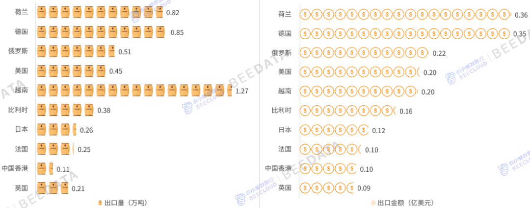 2024年,中国咖啡出口商业伙伴中,按出口金额排名前三的国度/地域顺次是荷兰、以及俄罗斯。