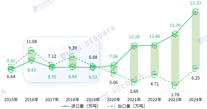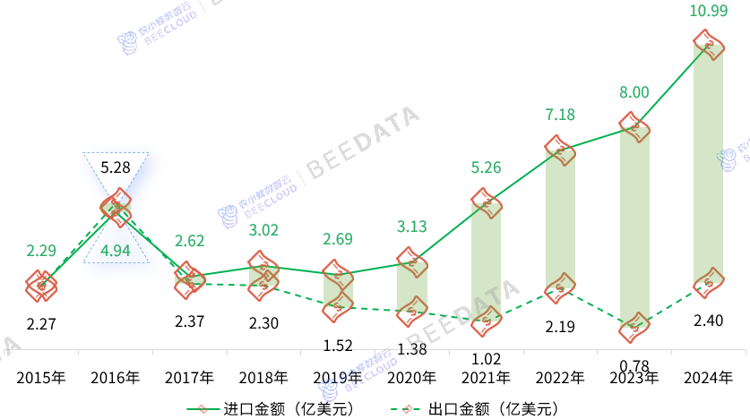 2015年至2024年,中国咖啡进口金额增加了8。7亿美元,增幅约为380。81%,年均复合增加率约为19。06%。