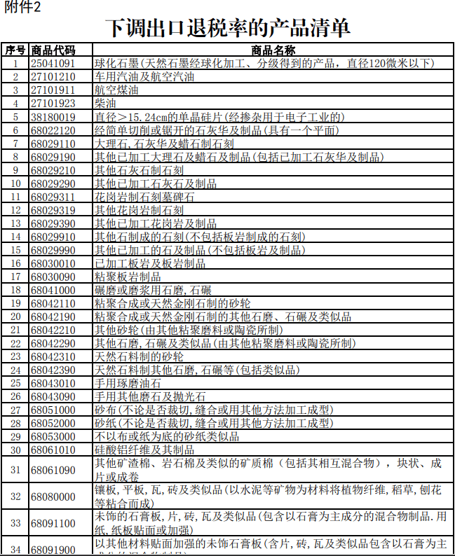一是:打消不产产物的出口退税,包罗化学改性的动、动物或微生物油、脂,铝合金制空心异型材、二是:将部门产物的出口退税率由13%下调至9%,好比成本油、光伏,电池、部门非金属矿物成品。三是:该通知布告自2024年12月1日起实施。而且表白通知布告所列产物合用的出口退税率以出口货色报关单说明的出口日期界定。
