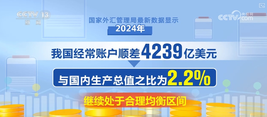 国度外汇办理局最新数据显示,2024年,我国经常账户顺差4239亿美元,取国内出产总值之比为2。2%,继续处于合理平衡区间。外商间接投资本钱金新增909亿美元,来华债券投资净流入468亿美元。2024岁暮,我国对外净资产为3。3万亿美元,